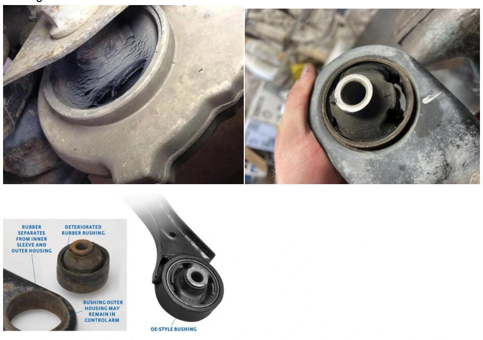 (Examples of cracked, torn, or deteriorated control arm bushings.)