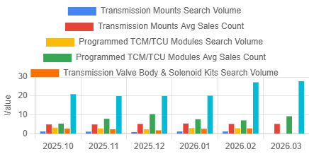 On Amazon auto parts, results vary by category. Sales for transmission mounts and engine mounts stayed stable from Oct 2025 to Feb 2026. Sales of TCM/TCU modules (Transmission Control Module/Unit) rose sharply from Oct to Dec 2025, then leveled off. The top performers were transmission valve bodies and transmission solenoid kits, with average monthly sales hitting 27.2K and 27.8K units in Feb and March 2026 respectively—a significant jump, making them the most active sub-segments.