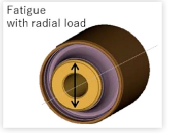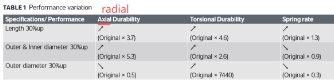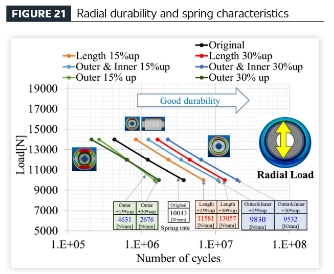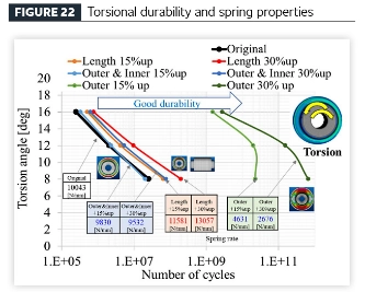 Research conclusions: When only the outer diameter is increased, durability against radial loads decreases, torsional durability improves, and spring performance softens. When both inner and outer diameters are increased, durability under radial loads and torsional loads both improve, while spring performance softens. When axial length is increased, durability under radial loads and torsional loads both improve, and spring performance stiffens.