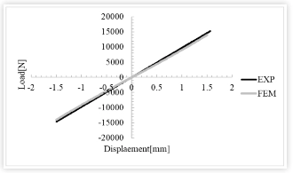 The bushing stiffness curve (force-displacement curve) is compared with experimental results, further proving the validity of the established FEM model. As can be seen from the figure: analysis using hyperelastic parameters identified from material test specimens demonstrates good consistency between experimental and analytical results on the load-displacement diagram.