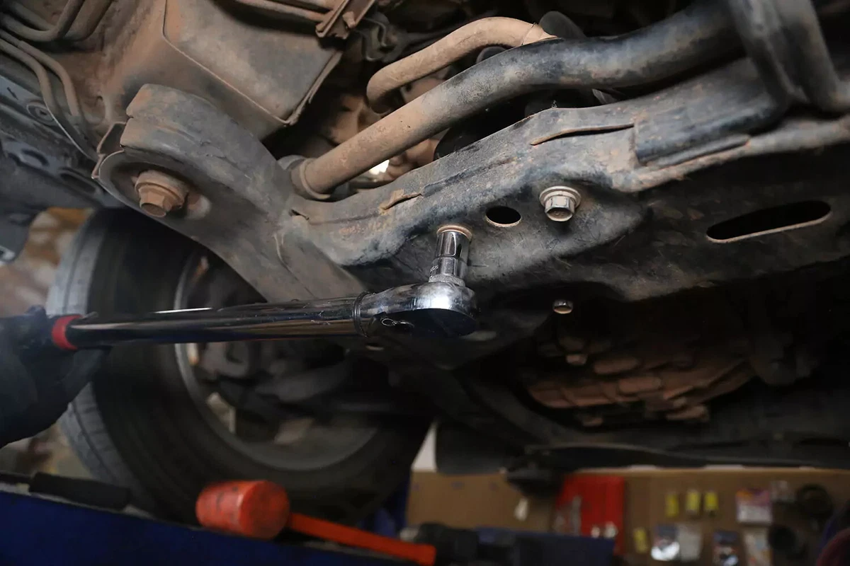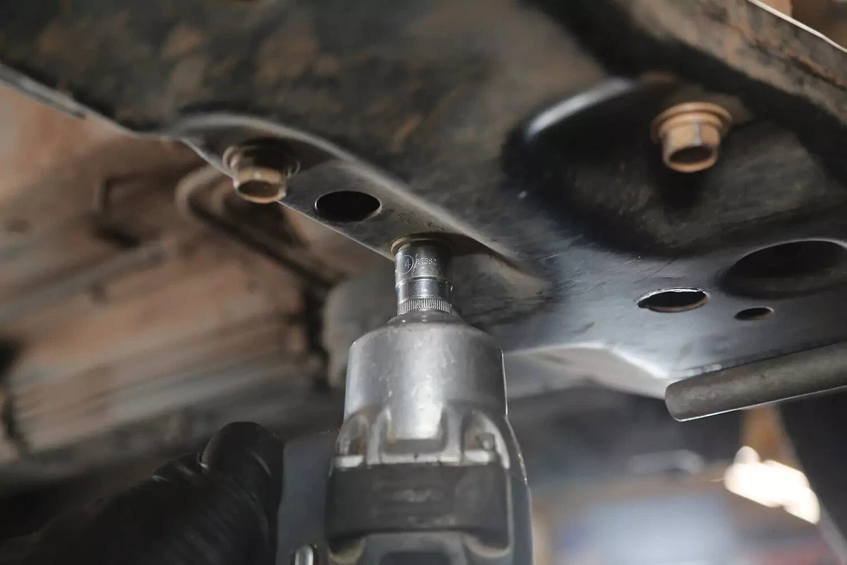 Tighten the chassis mount bolts and crossbolt. Use a torque wrench to tighten the bolts to the factory specs.